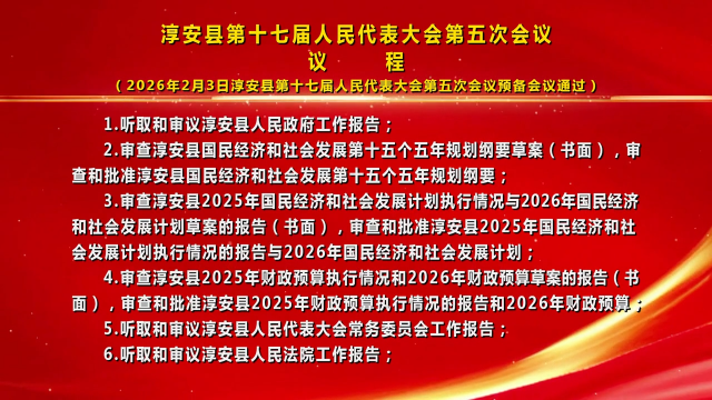 淳安县第十七届人民代表大会第五次会议议程(2026年2月3日淳安县第十七届人民代表大会第五次会议预备会议通过)