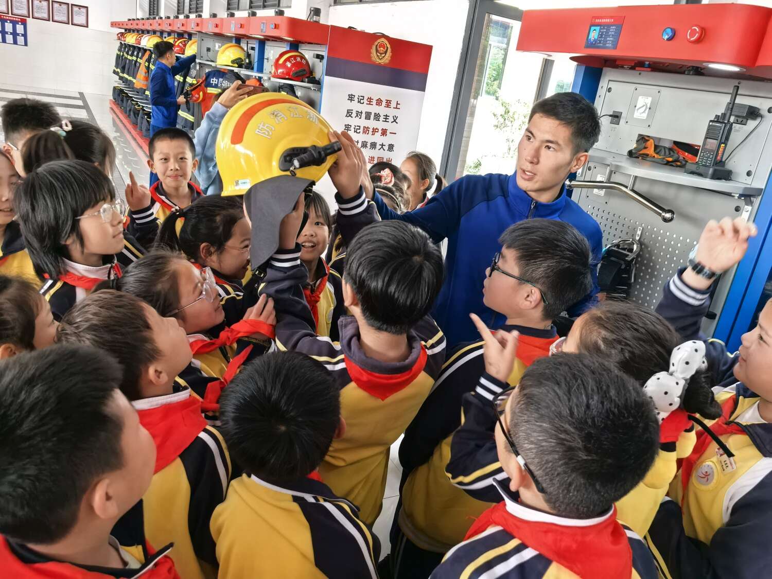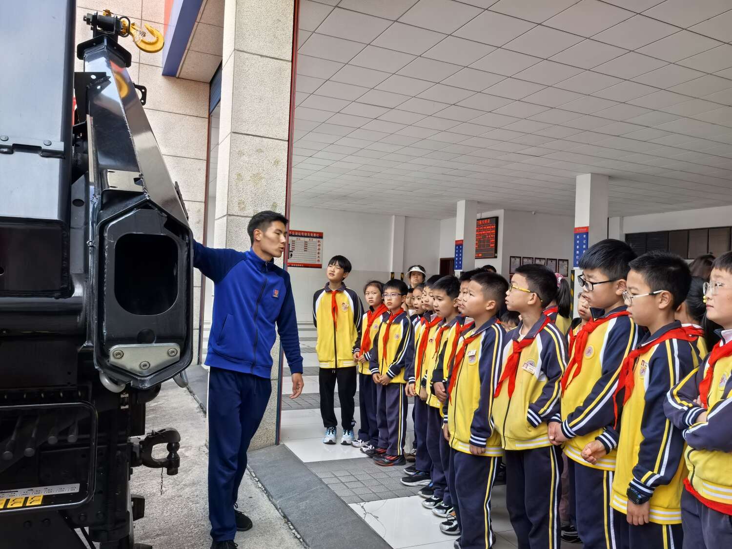 而探秘消防车环节,则将队员们的兴奋推向顶点。平日里只能在电视上看到的消防车,此刻近在眼前,消防员用通俗易懂的语言,揭秘消防车上各类器械的用途。从强大的消防器械到高压水枪的神奇功能,队员们目不转睛,求知的眼神中满是对消防知识的渴望。